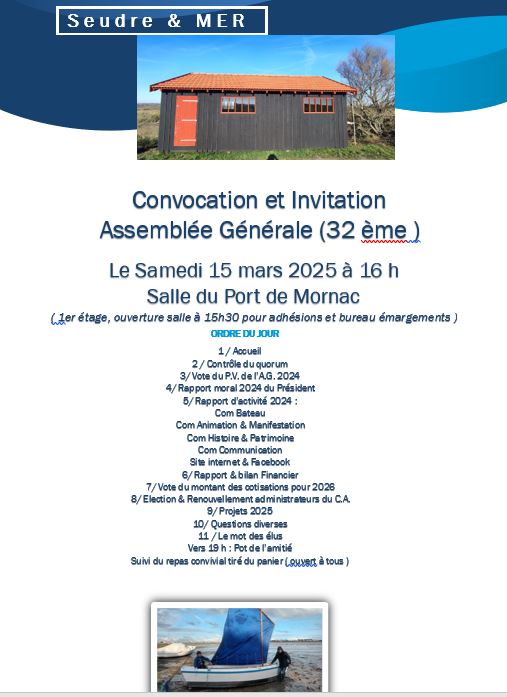 Pour ceux qui souhaitent en savoir plus, sur Seudre et Mer n’hésitez pas à venir nous rencontrer lors de notre Assemblée Générale. SAMEDI 15 MARS 16H SALLE DU PORT DE MORNAC SUR SEUDRE